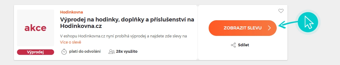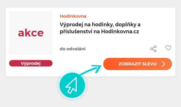 Vyberte si na naší stránce konkrétní Hodinkovna slevu a klikněte na tlačítko "Získej slevu". Automaticky budete přesměrováni přímo na akční nabídku v internetovém obchodě Hodinkovna.cz, kde můžete produkt nakoupit se slevou.