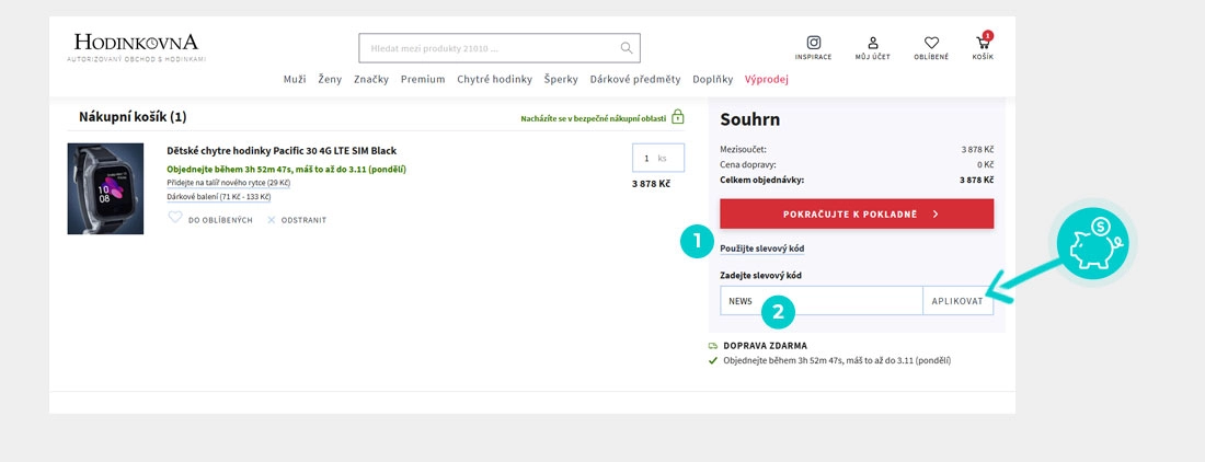 Vyberte si produkt v e-shopu Hodinkovna.cz, o který máte zájem, stiskněte tlačítko "Přidat do košíku" a produkt se automaticky vloží do nákupního košíku. Přímo v nákupním košíku najdete pod vámi vybraným produktem políčko "Zadejte slevový kód". Zde vložte zkopírovaný slevový kód nebo jej ručně vepište a potvrďte tlačítkem "Aplikovat".