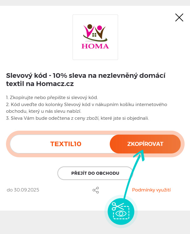 Zkopírujte nebo si opište slevový kód a klikněte na tlačítko "Přejít do obchodu". Následně budete přesměrováni přímo do eshopu Homacz.cz.