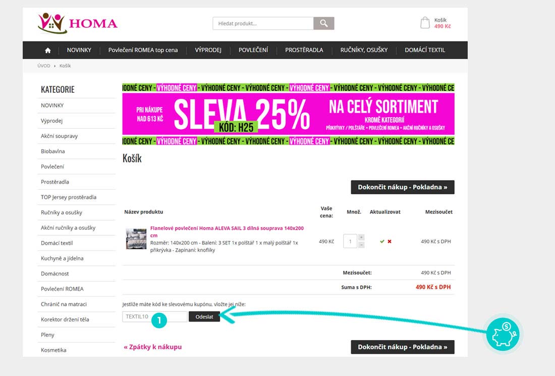 Vyberte si produkt v eshopu Homacz.cz, o který máte zájem, stiskněte tlačítko "Košík" a produkt se automaticky vloží do nákupního košíku. Přímo v nákupním košíku pod vybranými produkty klikněte na políčko "Jestliže máte kód ke slevovému kupónu, vložte jej níže:". Zde vložte zkopírovaný slevový kód nebo jej ručně vepište a potvrďte tlačítkem "Odeslat".