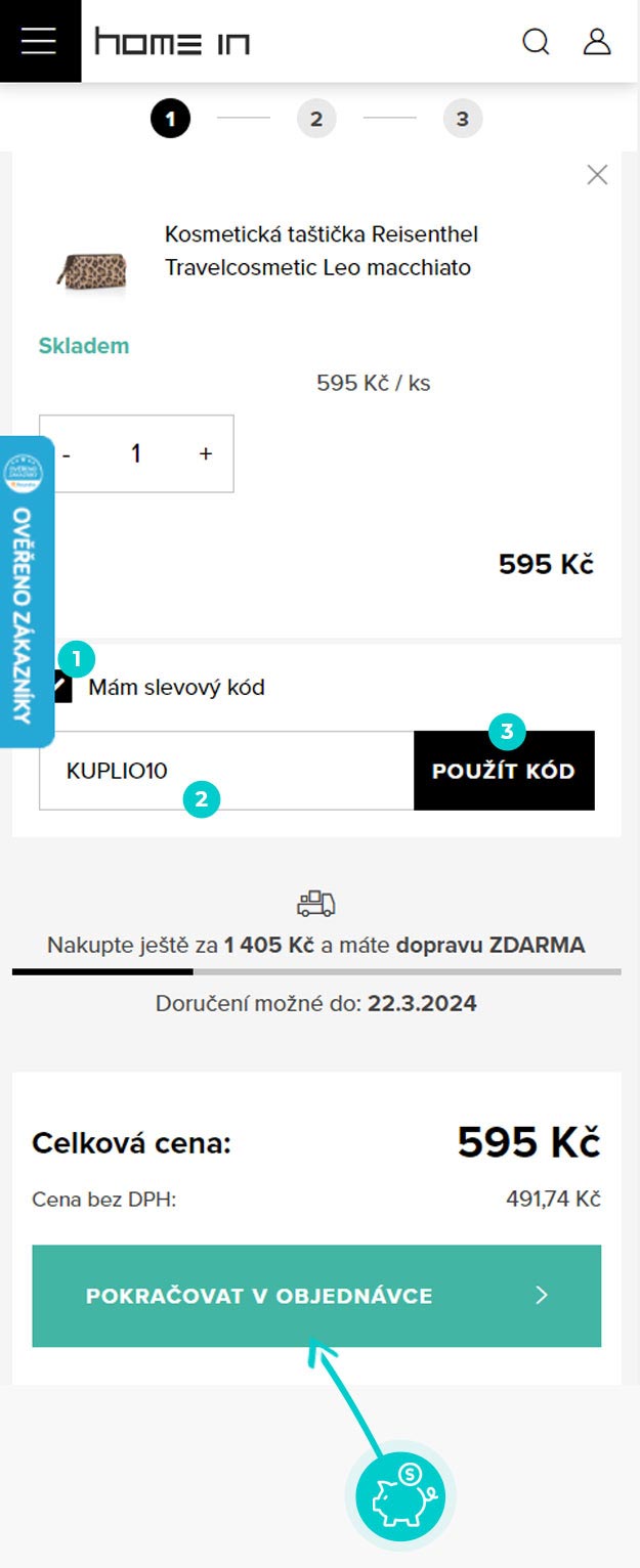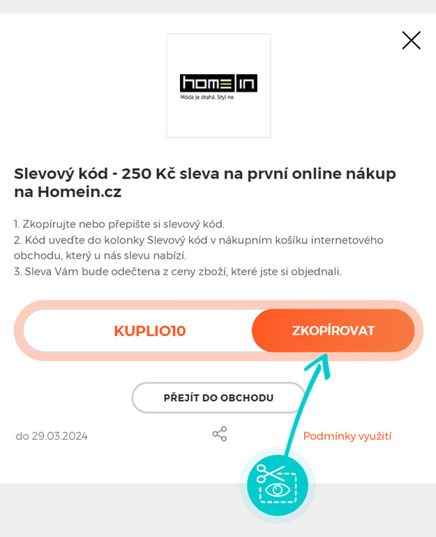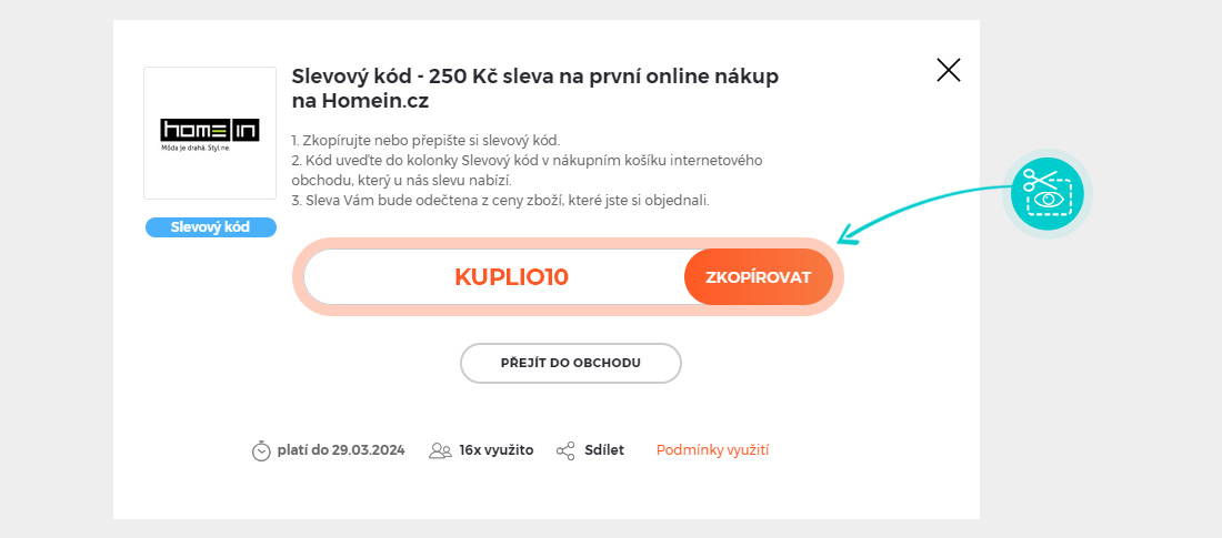 Zkopírujte nebo si opište slevový kód a klikněte na tlačítko "Přejít do obchodu". Následně budete přesměrováni přímo do e-shopu Homein.cz.