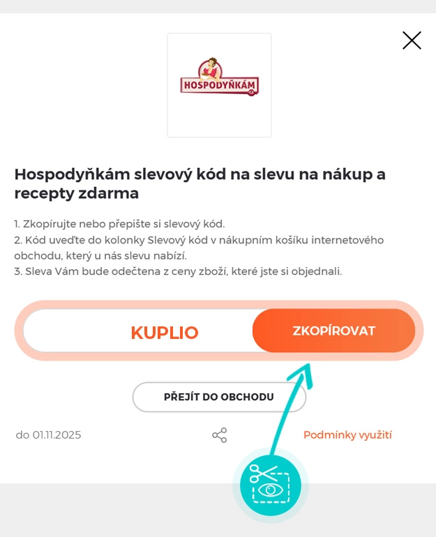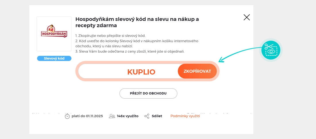 Zkopírujte nebo si opište slevový kód a klikněte na tlačítko "Přejít do obchodu". Následně budete přesměrováni přímo do eshopu Hospodynkam.cz.