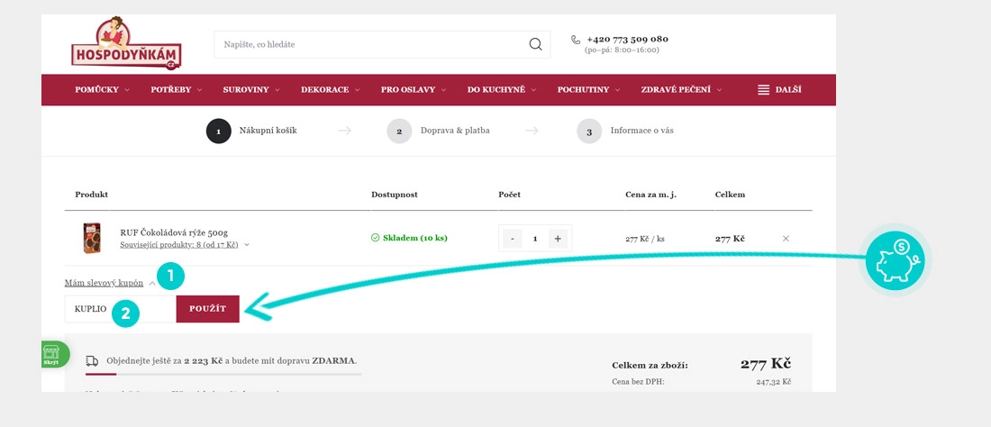 Vyberte si produkt v eshopu Hospodynkam.cz, o který máte zájem, stiskněte tlačítko "Koupit" a produkt se automaticky vloží do nákupního košíku. Přímo v nákupním košíku pod vybrnaými produkty klikněte na políčko "Mám slevový kupón". Zde vložte zkopírovaný slevový kód nebo jej ručně vepište a potvrďte tlačítkem "Použít".