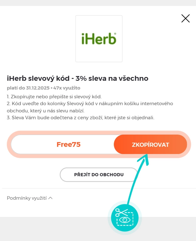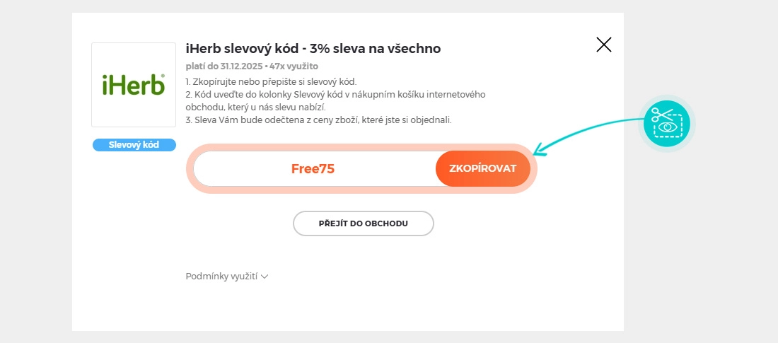 Zkopírujte nebo si opište slevový kód a klikněte na tlačítko "Přejít do obchodu". Následně budete přesměrováni přímo do eshopu iHerb.com.