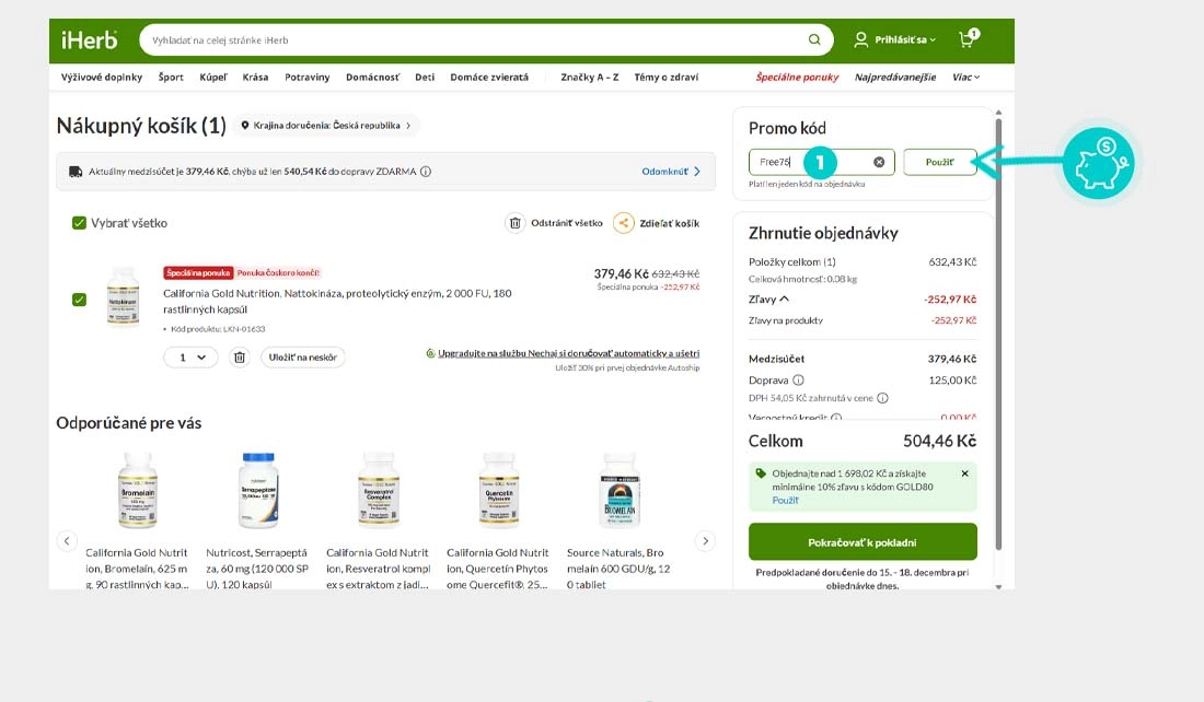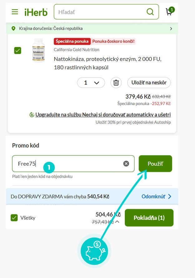 Vyberte si produkt v eshopu iHerb.com, o který máte zájem, stiskněte tlačítko "Přidat do košíkut" a produkt se automaticky vloží do nákupního košíku. Přímo v nákupním košíku najdete vedle vámi vybraných produktů políčko "Promo kód". Zde vložte zkopírovaný slevový kód nebo jej ručně vepište a potvrďte tlačítkem "Použít".