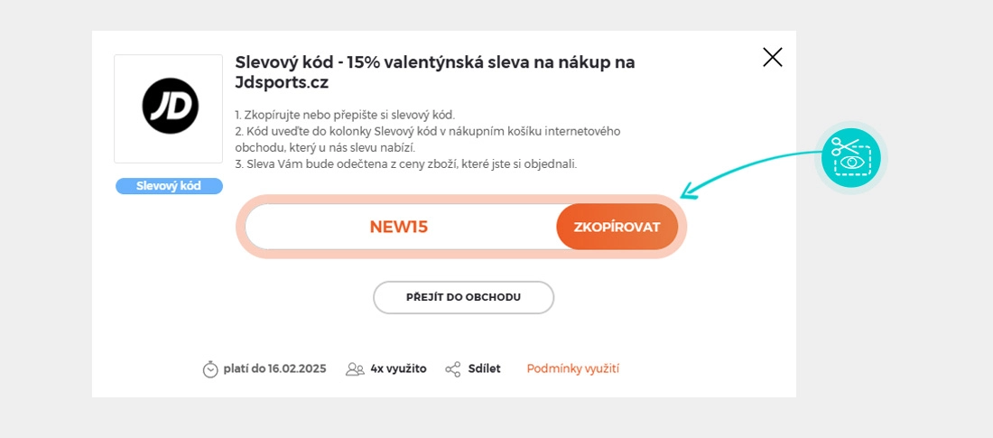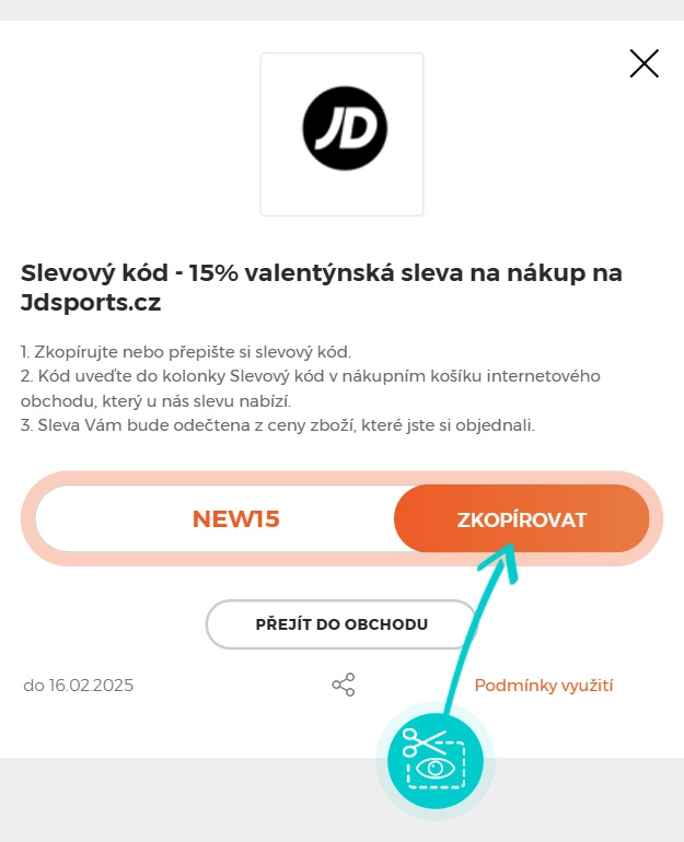 Zkopírujte nebo si opište slevový kód a klikněte na tlačítko "Přejít do obchodu". Následně budete přesměrováni přímo do e-shopu JDSports.cz.