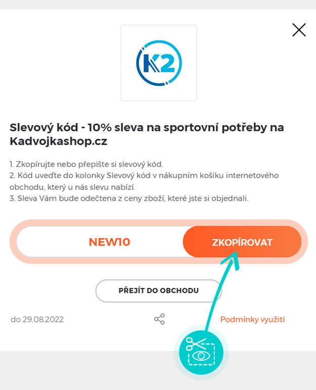 Zkopírujte nebo si opište slevový kód a klikněte na tlačítko "Přejít do obchodu". Následně budete přesměrováni přímo do e-shopu Kadvojkashop.cz.