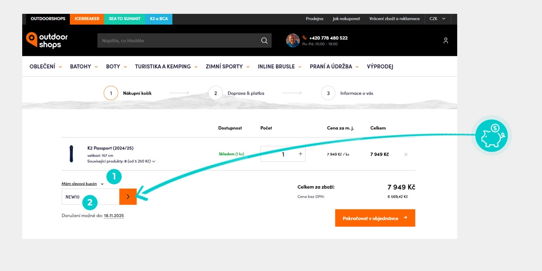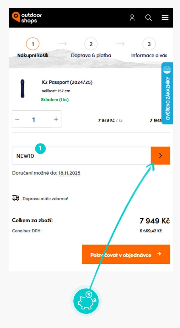 Vyberte si produkt v e-shopu Kadvojkashop.cz, o který máte zájem, stiskněte tlačítko "Vložit do košíku" a produkt se automaticky vloží do nákupního košíku. Přímo v nákupním košíku pod vybranými produkty v sekci Dokončit objednávku klikněte na políčko "Vložit slevový kupón“. Zde vložte zkopírovaný slevový kód nebo jej ručně vepište a potvrďte tlačítkem šipky.