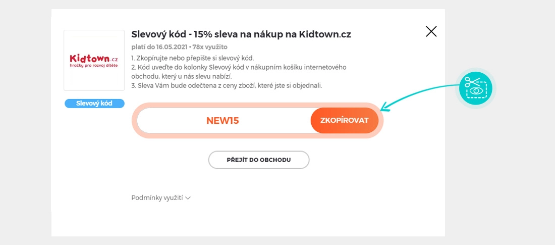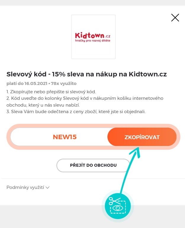 Zkopírujte nebo si opište slevový kód a klikněte na tlačítko "Přejít do obchodu". Následně budete přesměrováni přímo do eshopu Kidtown.cz.