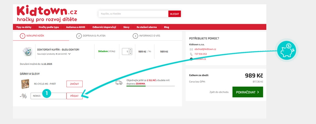 Nevíte, jak přesně fungují slevové kódy na Kidtown.cz? Nabízíme Vám postup, jak si při nákupu můžete uplatnit slevové kódy rychle a jednoduše: