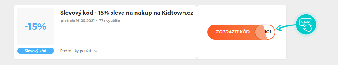 Vyberte si konkrétní slevový kód na naší stránce, který si chcete uplatnit v eshopu Kidtown.cz. Klikněte na oranžové tlačítko "Zobrazit kód".