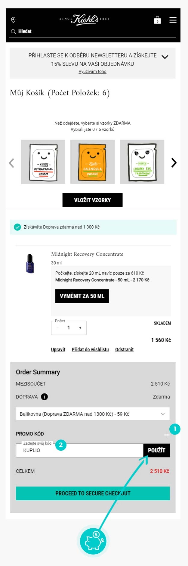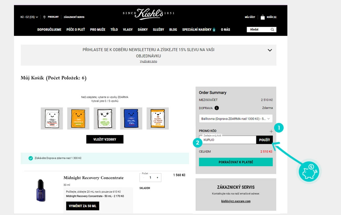 Vyberte si produkt v eshopu Kiehls.cz, o který máte zájem, stiskněte tlačítko "Přidat do košíku" a produkt se automaticky vloží do nákupního košíku. Přímo v nákupním košíku, v souhrnu objednávky vpravo je pod dopravou "Promo kód". Po kliknutí na + se otevře pole "Zadejte svůj kód". Zde vložte zkopírovaný slevový kód nebo jej ručně vepište a potvrďte tlačítkem "Použít".