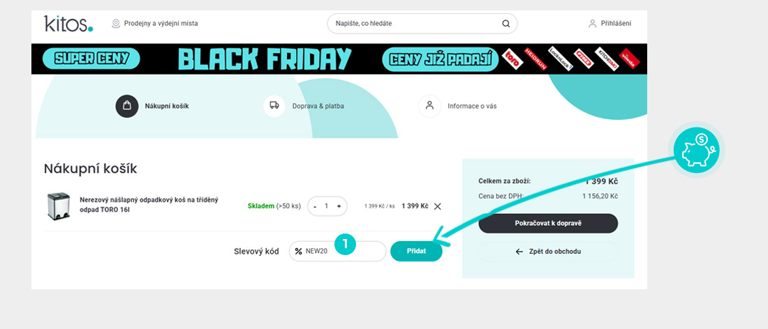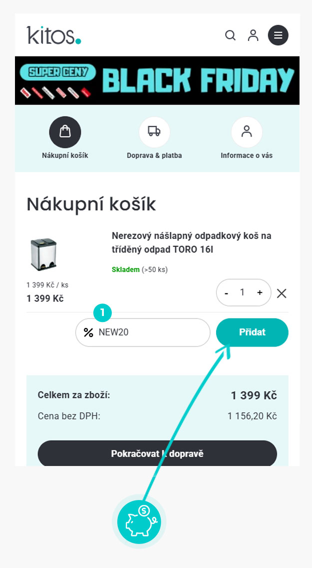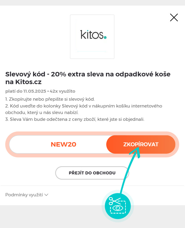Zkopírujte nebo si opište slevový kód a klikněte na tlačítko "Přejít do obchodu". Následně budete přesměrováni přímo do eshopu Kitos.cz.