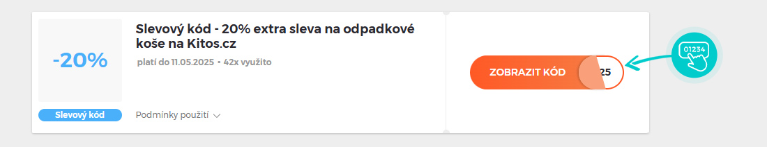 Vyberte si konkrétní slevový kód na naší stránce, který si chcete uplatnit v eshopu Kitos.cz. Klikněte na oranžové tlačítko "Zobrazit kód".