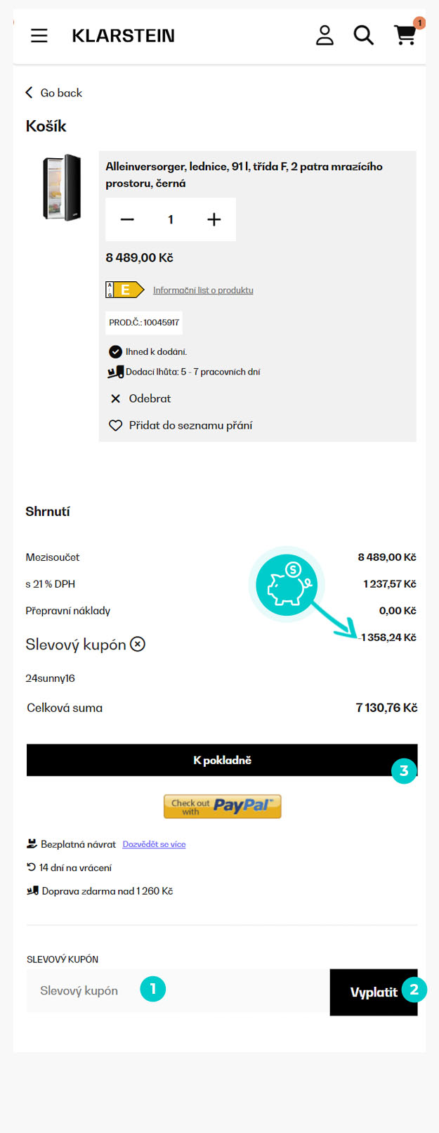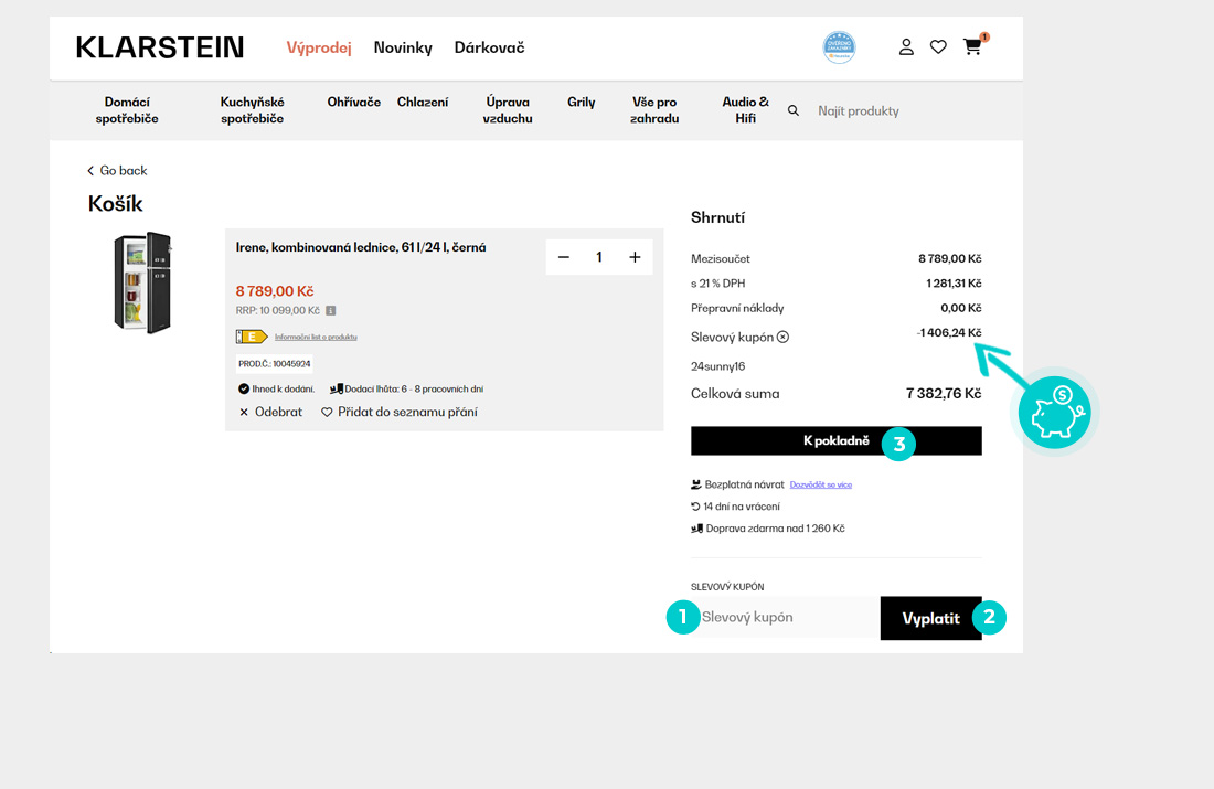 Vyberte si produkt v e-shopu Klarstein.cz, o který máte zájem, stiskněte tlačítko "Přidat do košíku" a produkt se automaticky vloží do nákupního košíku. Přímo v nákupním košíku najdete vpravo políčko "Slevový kupón". Zde vložte zkopírovaný slevový kód nebo jej ručně vepište a potvrďte tlačítkem "Vyplatit".