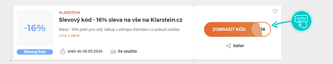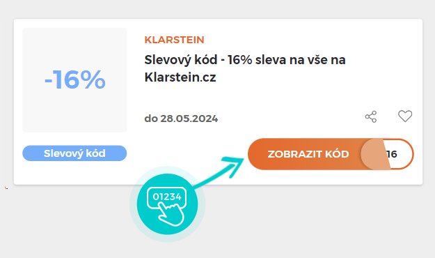 Vyberte si konkrétní slevový kód na naší stránce, který si chcete uplatnit v e-shopu Klarstein.cz. Klikněte na oranžové tlačítko "Zobrazit kód".