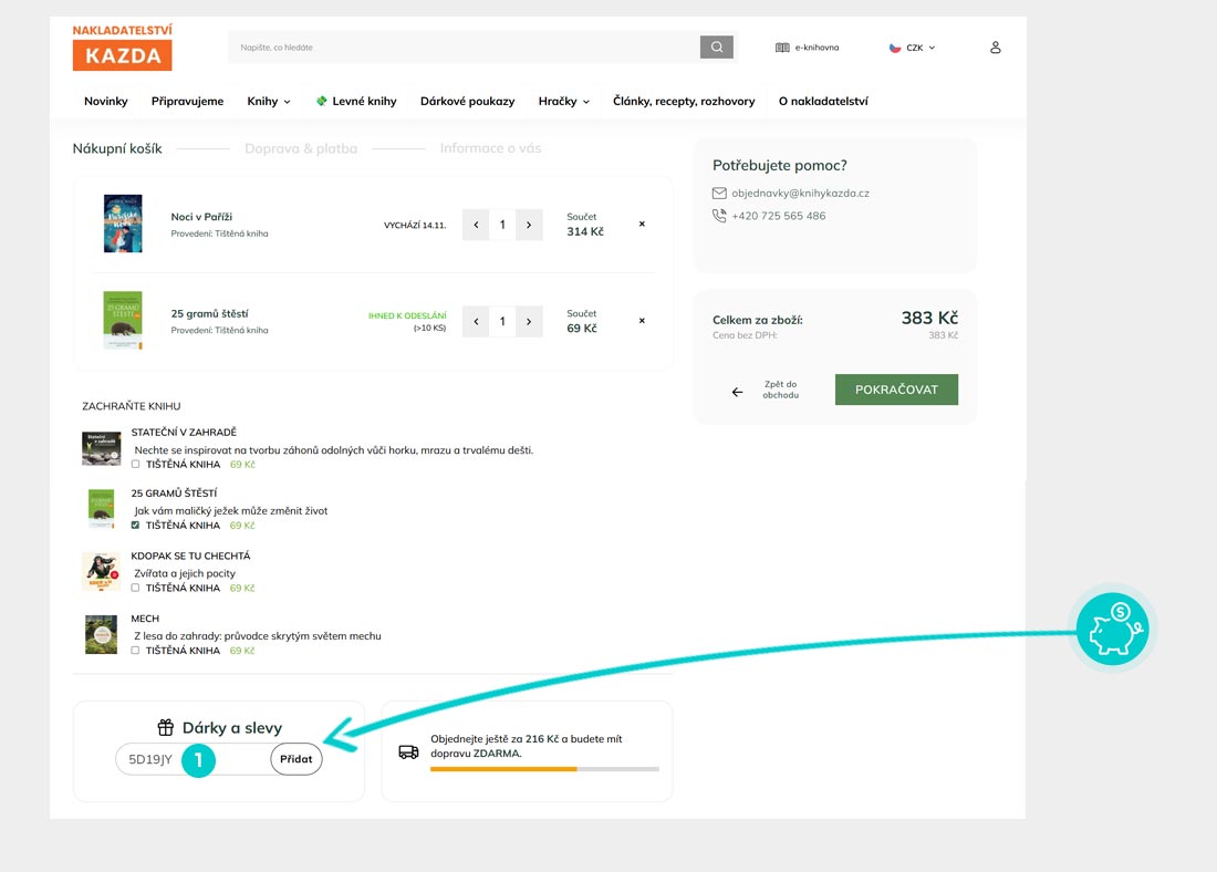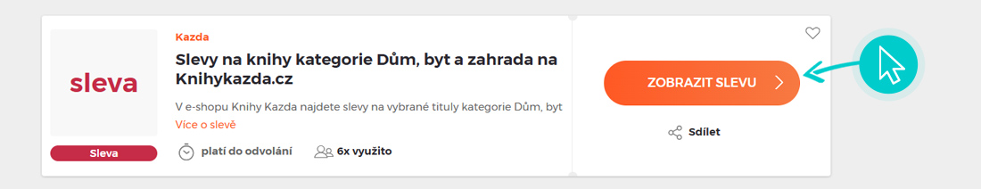 Vyberte si na naší stránce konkrétní Knihy Kazda slevu a klikněte na tlačítko "Získej slevu". Automaticky budete přesměrováni přímo na akční nabídku v internetovém obchodě Kazda.cz, kde můžete produkt nakoupit se slevou.