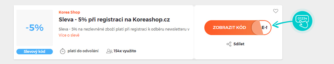 Vyberte si konkrétní slevový kód na naší stránce, který si chcete uplatnit v eshopu Koreashop.cz. Klikněte na oranžové tlačítko "Zobrazit kód".