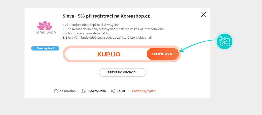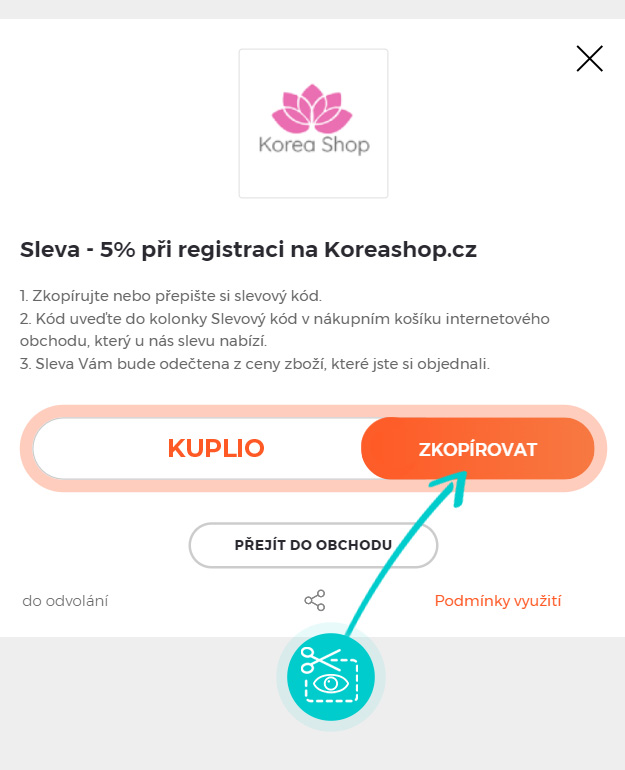 Zkopírujte nebo si opište slevový kód a klikněte na tlačítko "Přejít do obchodu". Následně budete přesměrováni přímo do eshopu Koreashop.cz.