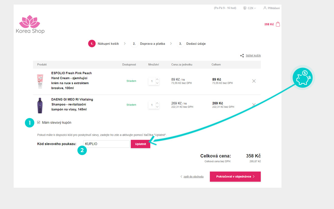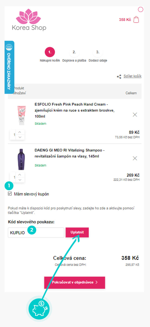 Nevíte, jak přesně fungují slevové kódy na Koreashop.cz? Nabízíme Vám postup, jak si při nákupu můžete uplatnit slevové kódy rychle a jednoduše: