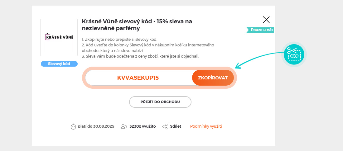 Zkopírujte nebo si opište slevový kód a klikněte na tlačítko "Přejít do obchodu". Následně budete přesměrováni přímo do e-shopu Krásnévůně.cz.