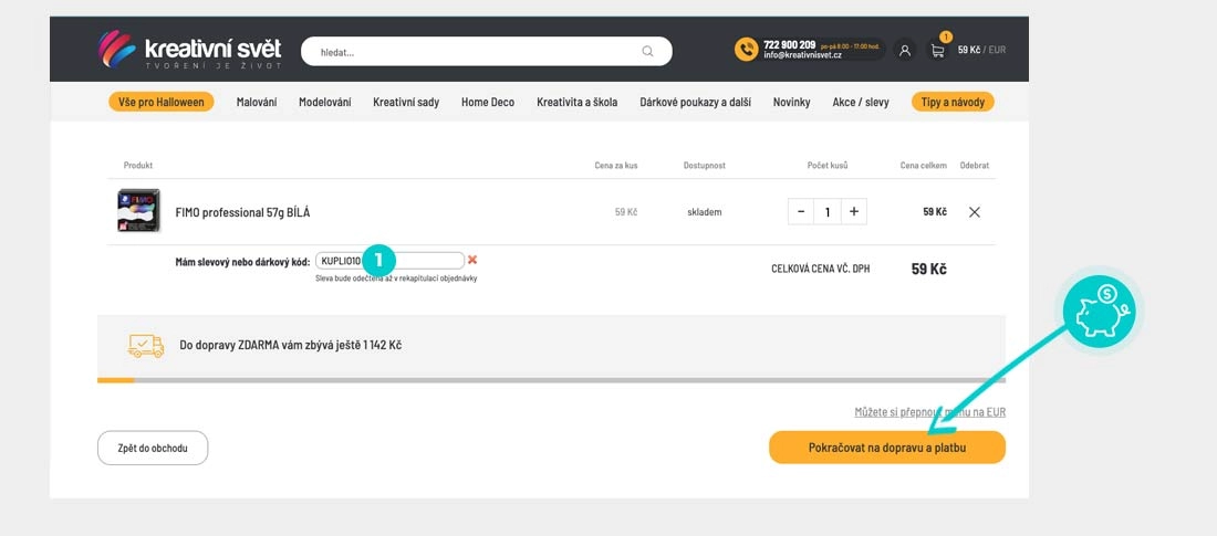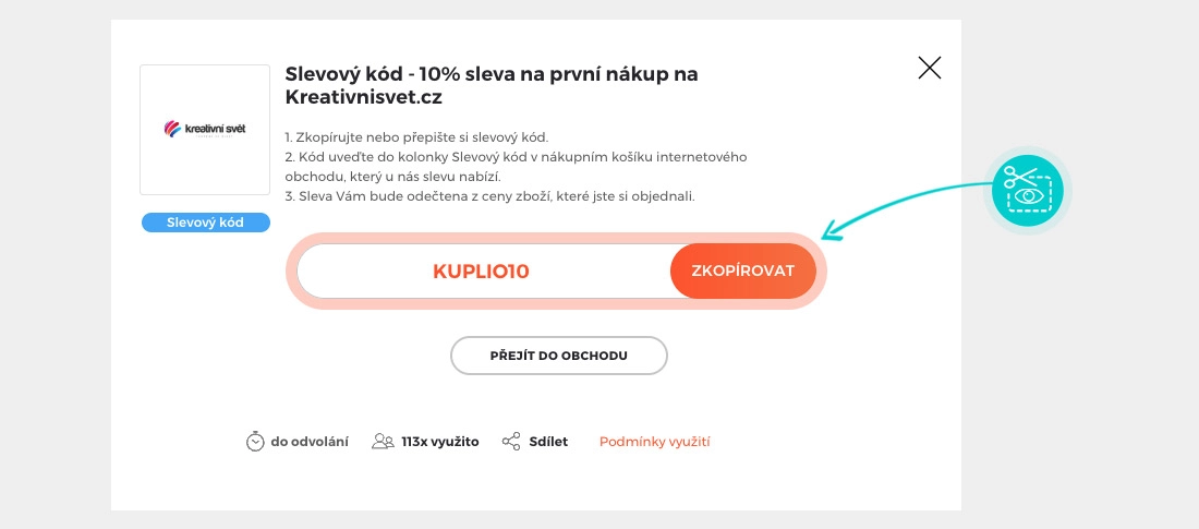 Zkopírujte nebo si opište slevový kód a klikněte na tlačítko "Přejít do obchodu". Následně budete přesměrováni přímo do eshopu kreativnisvet.cz.