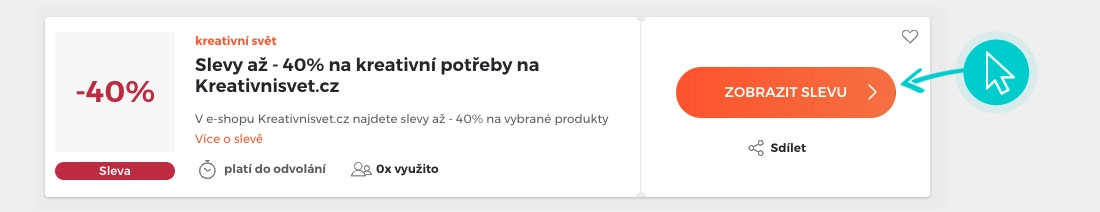 Vyberte si na naší stránce konkrétní kreativní svět slevu a klikněte na tlačítko "Zobrazit slevu". Automaticky budete přesměrováni přímo na akční nabídku v internetovém obchodě kreativnisvet.cz, kde můžete produkt nakoupit se slevou.
