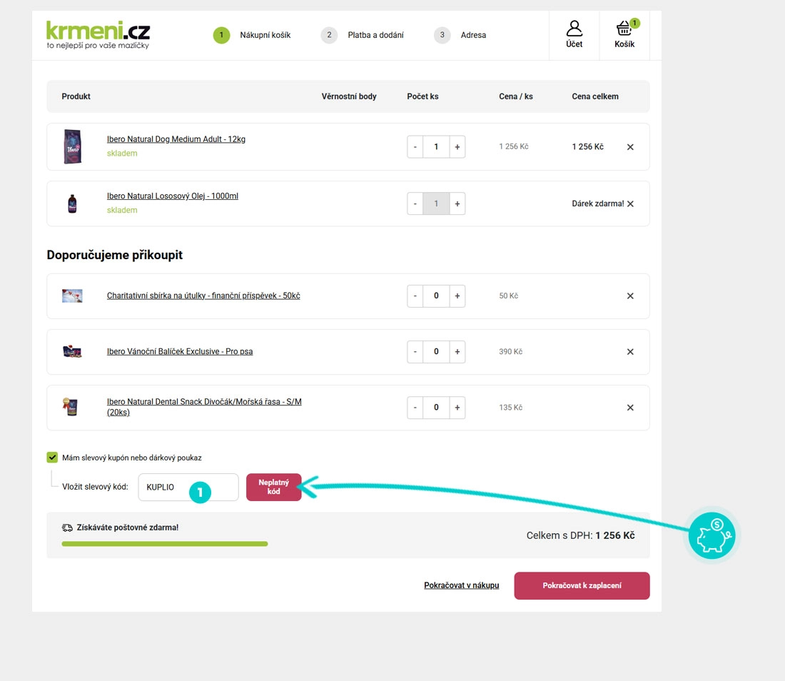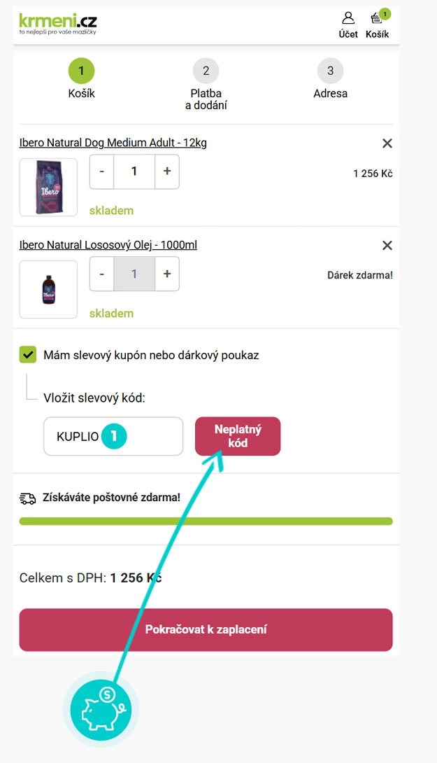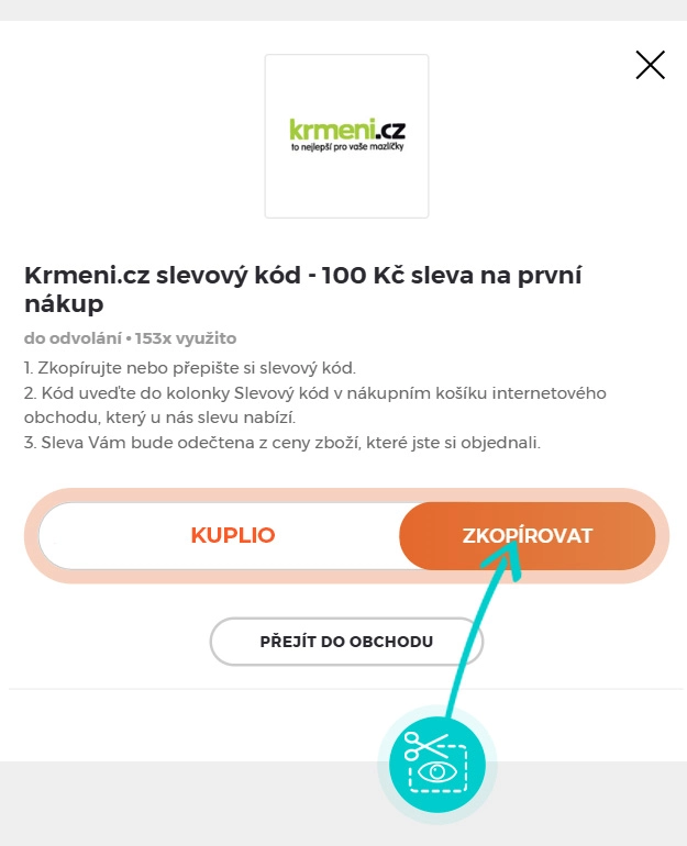 Zkopírujte nebo si opište slevový kód a klikněte na tlačítko "Přejít do obchodu". Následně budete přesměrováni přímo do eshopu Krmeni.cz.