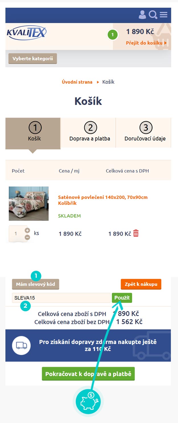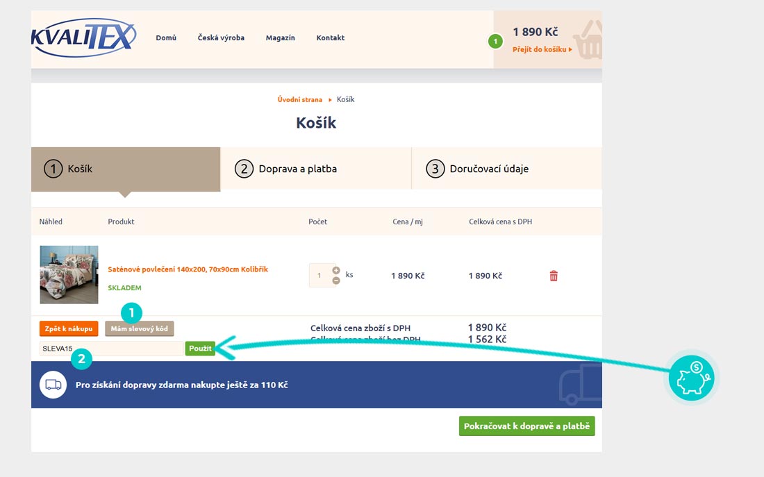 Zkopírujte nebo si opište slevový kód a klikněte na tlačítko "Přejít do obchodu". Následně budete přesměrováni přímo do eshopu kvalitex.cz.