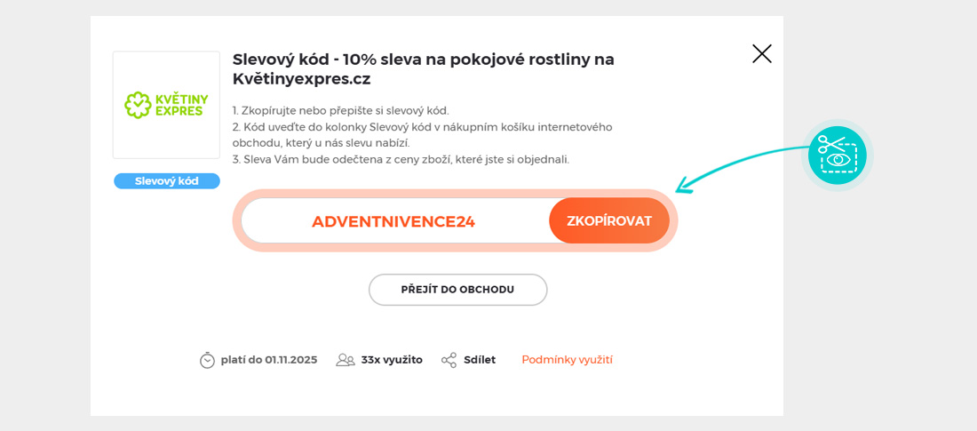 Zkopírujte nebo si opište slevový kód a klikněte na tlačítko "Přejít do obchodu". Následně budete přesměrováni přímo do eshopu Květinyexpres.cz.