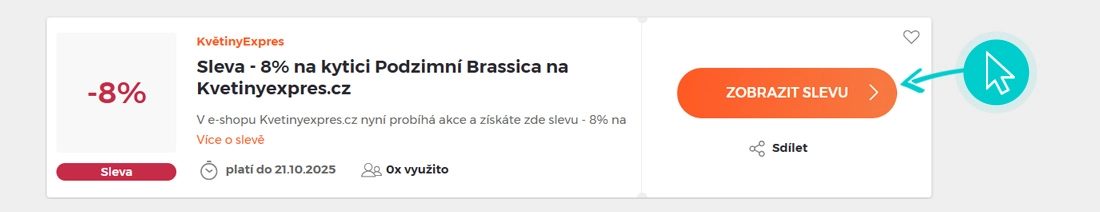 Vyberte si na naší stránce konkrétní KvětinyExpres slevu a klikněte na tlačítko "Zobrazit slevu". Automaticky budete přesměrováni přímo na akční nabídku v internetovém obchodě Květinyexpres.cz, kde můžete produkt nakoupit se slevou.