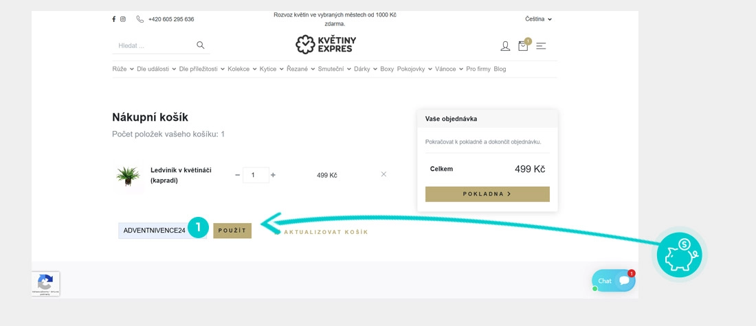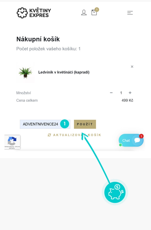 Vyberte si produkt v eshopu Květinyexpres.cz, o který máte zájem, stiskněte tlačítko "Vložit do košíku" a produkt se automaticky vloží do nákupního košíku. Přímo v nákupním košíku vedle vybraných produktů klikněte na políčko "Kód poukazu". Zde vložte zkopírovaný slevový kód nebo jej ručně vepište a potvrďte tlačítkem "Použít".