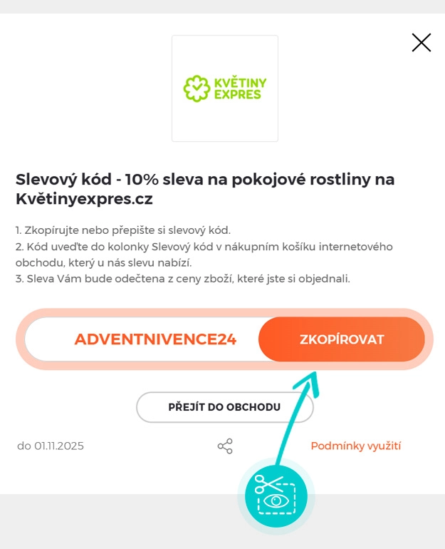 Zkopírujte nebo si opište slevový kód a klikněte na tlačítko "Přejít do obchodu". Následně budete přesměrováni přímo do eshopu Květinyexpres.cz.