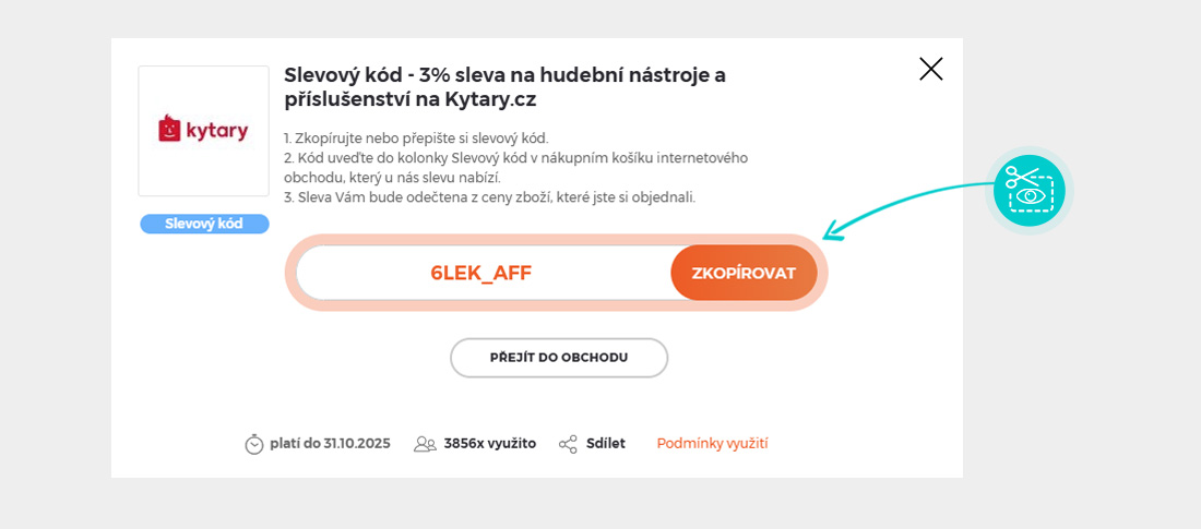 Zkopírujte nebo si opište slevový kód a klikněte na tlačítko "Přejít do obchodu". Následně budete přesměrováni přímo do eshopu Kytary.cz.