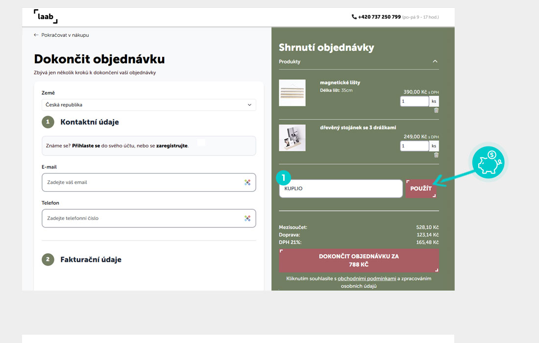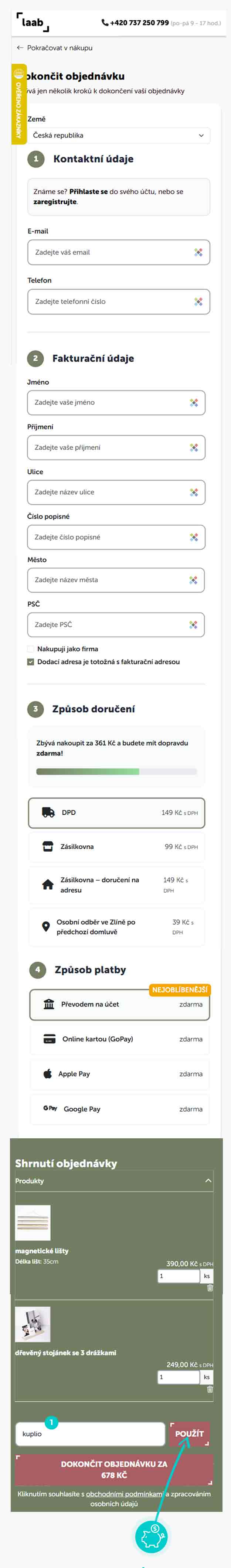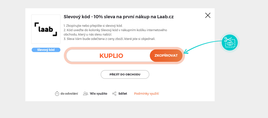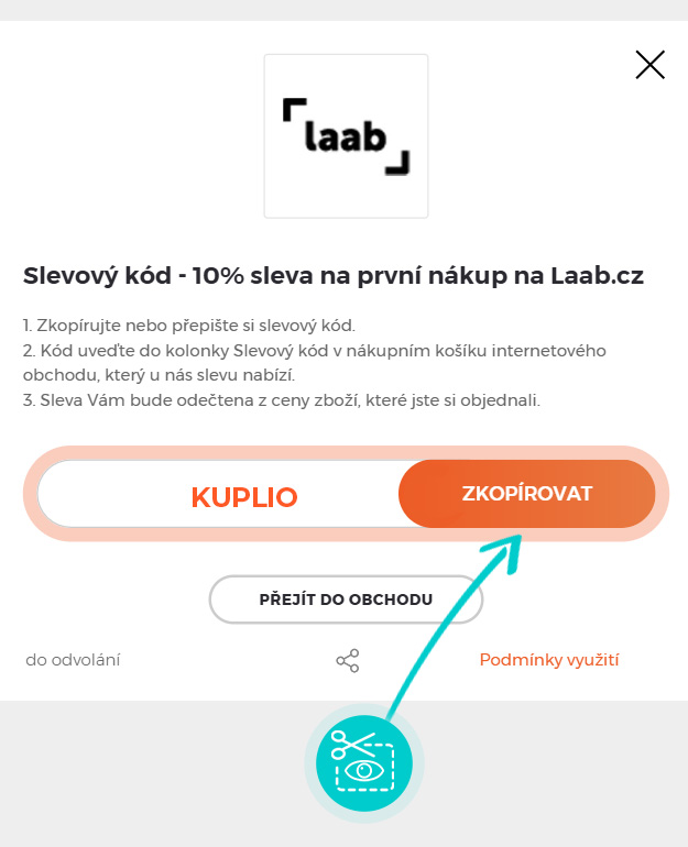 Zkopírujte nebo si opište slevový kód a klikněte na tlačítko "Přejít do obchodu". Následně budete přesměrováni přímo do e-shopu Laab.cz.