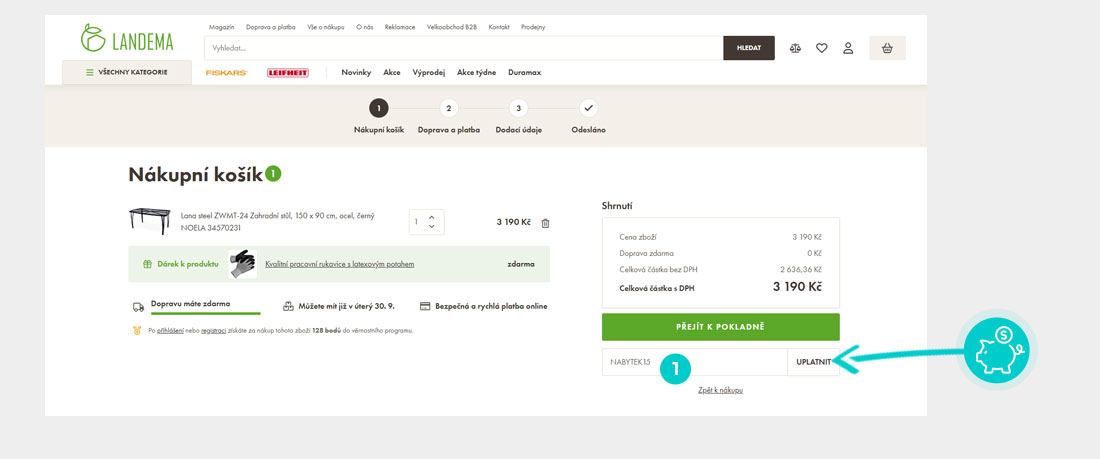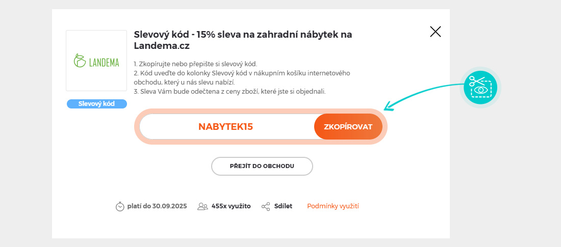 Zkopírujte nebo si opište slevový kód a klikněte na tlačítko "Přejít do obchodu". Následně budete přesměrováni přímo do e-shopu Landema.cz.