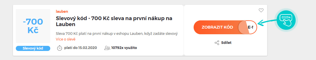 Vyberte si konkrétní slevový kód na naší stránce, který si chcete uplatnit v eshopu lauben.com. Klikněte na oranžové tlačítko "Zobrazit kód".