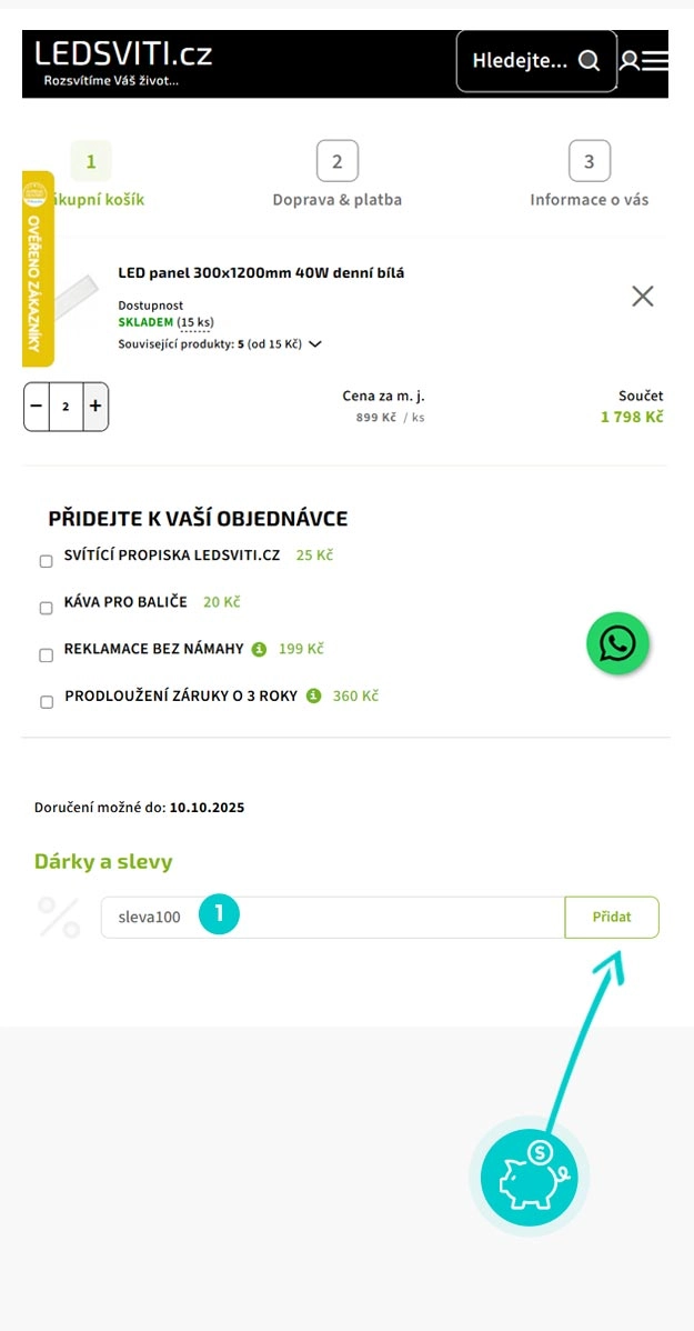 Vyberte si produkt v eshopu ledsviti.cz, o který máte zájem, stiskněte tlačítko "Do košíku" a produkt se automaticky vloží do nákupního košíku. Přímo v nákupním košíku najdete napravo políčko "Přidat kupón". Zde vložte zkopírovaný slevový kód nebo jej ručně vepište a potvrďte tlačítkem "Přidat".
