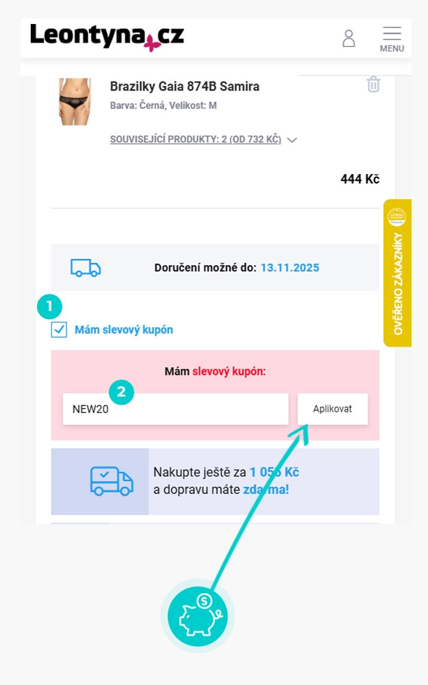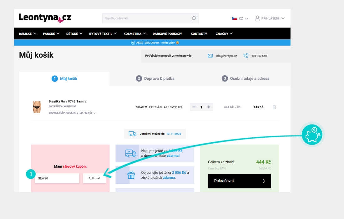 Vyberte si produkt v e-shopu leontyna.cz, o který máte zájem, stiskněte tlačítko "Přidat do košíku" a produkt se automaticky vloží do nákupního košíku. Přímo v nákupním košíku pod vybranými produkty klikněte na políčko "Zadejte kód kupónu". Zde vložte zkopírovaný slevový kód nebo jej ručně vepište a potvrďte tlačítkem "Aplikovat".