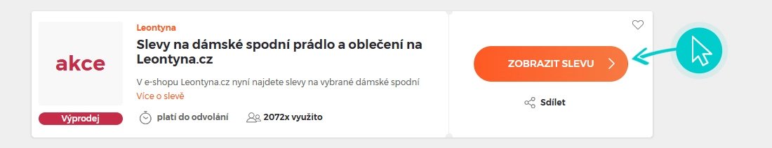 Vyberte si na naší stránce konkrétní Leontyna slevu a klikněte na tlačítko „Viz slevu“. Automaticky budete přesměrováni přímo na akční nabídku v internetovém obchodě leontyna.cz, kde můžete produkt nakoupit se slevou.