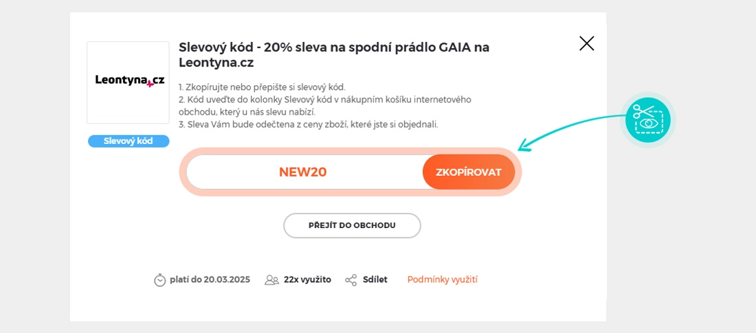 Zkopírujte nebo si odepište slevový kód a klikněte na tlačítko „Přejít do obchodu“. Následně budete přesměrováni přímo do e-shopu leontyna.cz.