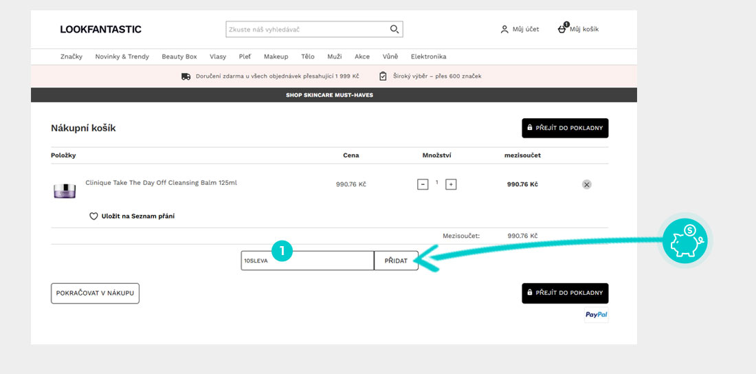 Vyberte si produkt v eshopu Lookfantastic.cz, o který máte zájem, stiskněte tlačítko "Nakupovat nyní" a produkt se automaticky vloží do nákupního košíku. Přímo v nákupním košíku pod vybranými produkty klikněte na políčko "Mám slevový kód? Zadajte ho prosím zde". Zde vložte zkopírovaný slevový kód nebo jej ručně vepište a potvrďte tlačítkem "Vložiť".