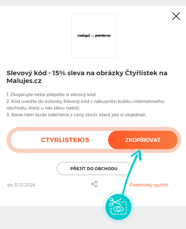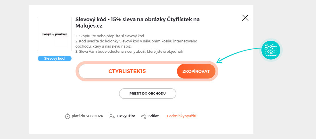 Zkopírujte nebo si opište slevový kód a klikněte na tlačítko "Přejít do obchodu". Následně budete přesměrováni přímo do e-shopu Malujes.cz.