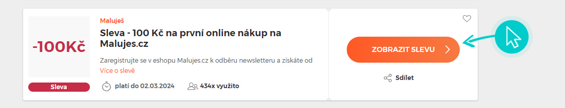 Vyberte si konkrétní slevový kód na naší stránce, který si chcete uplatnit v e-shopu Malujes.cz. Klikněte na oranžové tlačítko "Zobrazit kód".