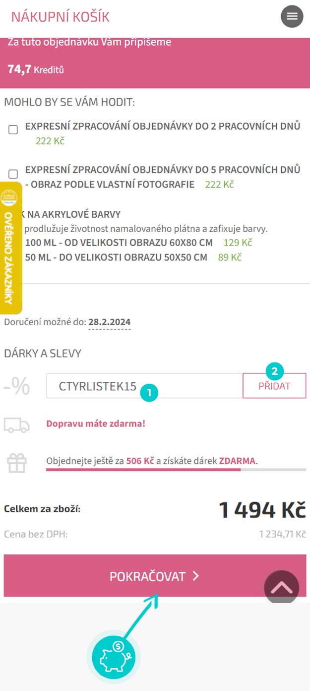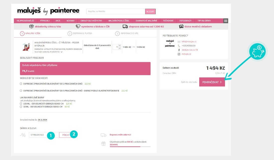 Vyberte si produkt v e-shopu Malujes.cz, o který máte zájem, stiskněte tlačítko "Přidat do košíku" a produkt se automaticky vloží do nákupního košíku. Přímo v nákupním košíku najdete pod vámi vybraným produktem políčko "Vložit slevový kupón". Zde vložte zkopírovaný slevový kód nebo jej ručně vepište a potvrďte tlačítkem "Přidat".