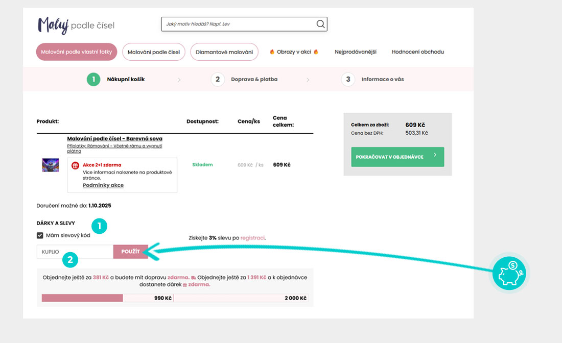 Nevíte, jak přesně fungují slevové kódy na Malujpodlecisel.cz? Nabízíme Vám postup, jak si při nákupu můžete uplatnit slevové kódy rychle a jednoduše: