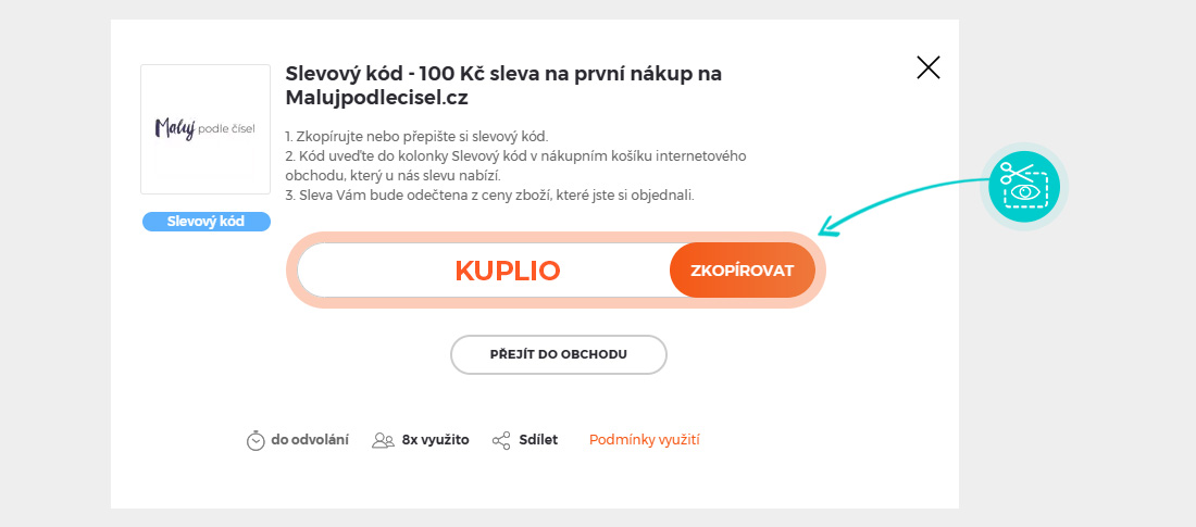Zkopírujte nebo si opište slevový kód a klikněte na tlačítko "Přejít do obchodu". Následně budete přesměrováni přímo do eshopu Malujpodlecisel.cz.
