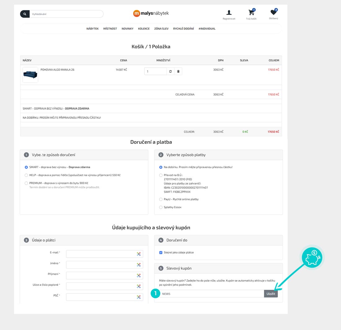 Vyberte si produkt v eshopu Malys-nabytek.cz, o který máte zájem, stiskněte tlačítko "Do košíku" a produkt se automaticky vloží do nákupního košíku. Přímo v nákupním košíku pod vybranými produkty je v sekci Údaje kupujícího a slevový kupón políčko Slevový kupón, kde se nachází pole "Vložte kód vašeho kupónu". Zde vložte zkopírovaný slevový kód nebo jej ručně vepište a potvrďte tlačítkem "Uložit".