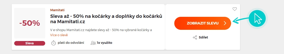 Vyberte si na naší stránce konkrétní Mamitati slevu a klikněte na tlačítko "Získej slevu". Automaticky budete přesměrováni přímo na akční nabídku v internetovém obchodě mamitati.cz, kde můžete produkt nakoupit se slevou.