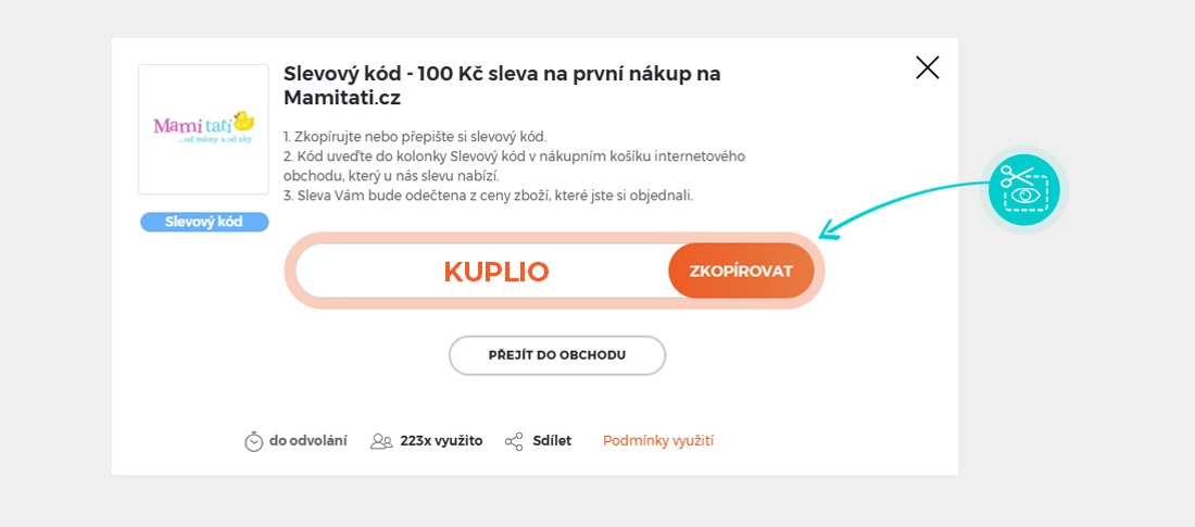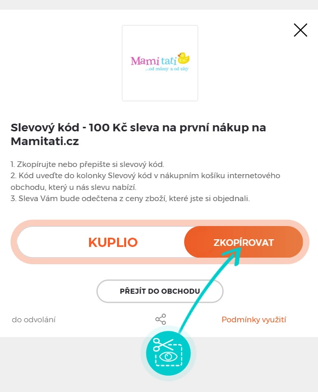 Zkopírujte nebo si opište slevový kód a klikněte na tlačítko "Přejít do obchodu". Následně budete přesměrováni přímo do e-shopu mamitati.cz.
